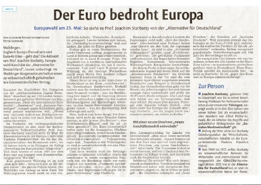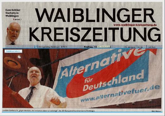 "Zugleich Europa-Freund sein und Euro-Kritiker - geht das? Die Antwort von Prof. Joachim Starbatty, Europawahl-Kandidat der "Alternative für Deutschland" lautet: unbedingt. Im Waiblinger Bürgerzentrum hielt er einen so volkswirtschaftlich gehaltvollen wie laienverständlichen Vortrag."